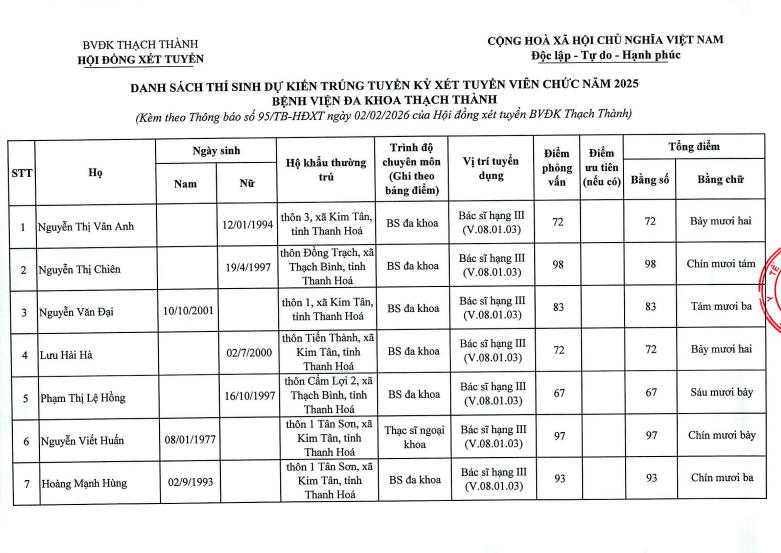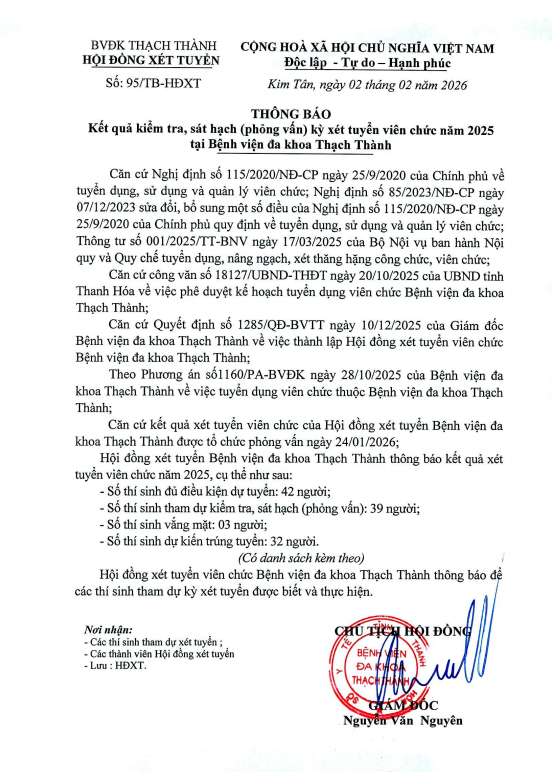 THÔNG BÁO : Kết quả kiểm tra, sát hạch (phông vấn) kỳ xét tuyển viên chức năm 2025 tại Bệnh viện đa khoa Thạch Thành